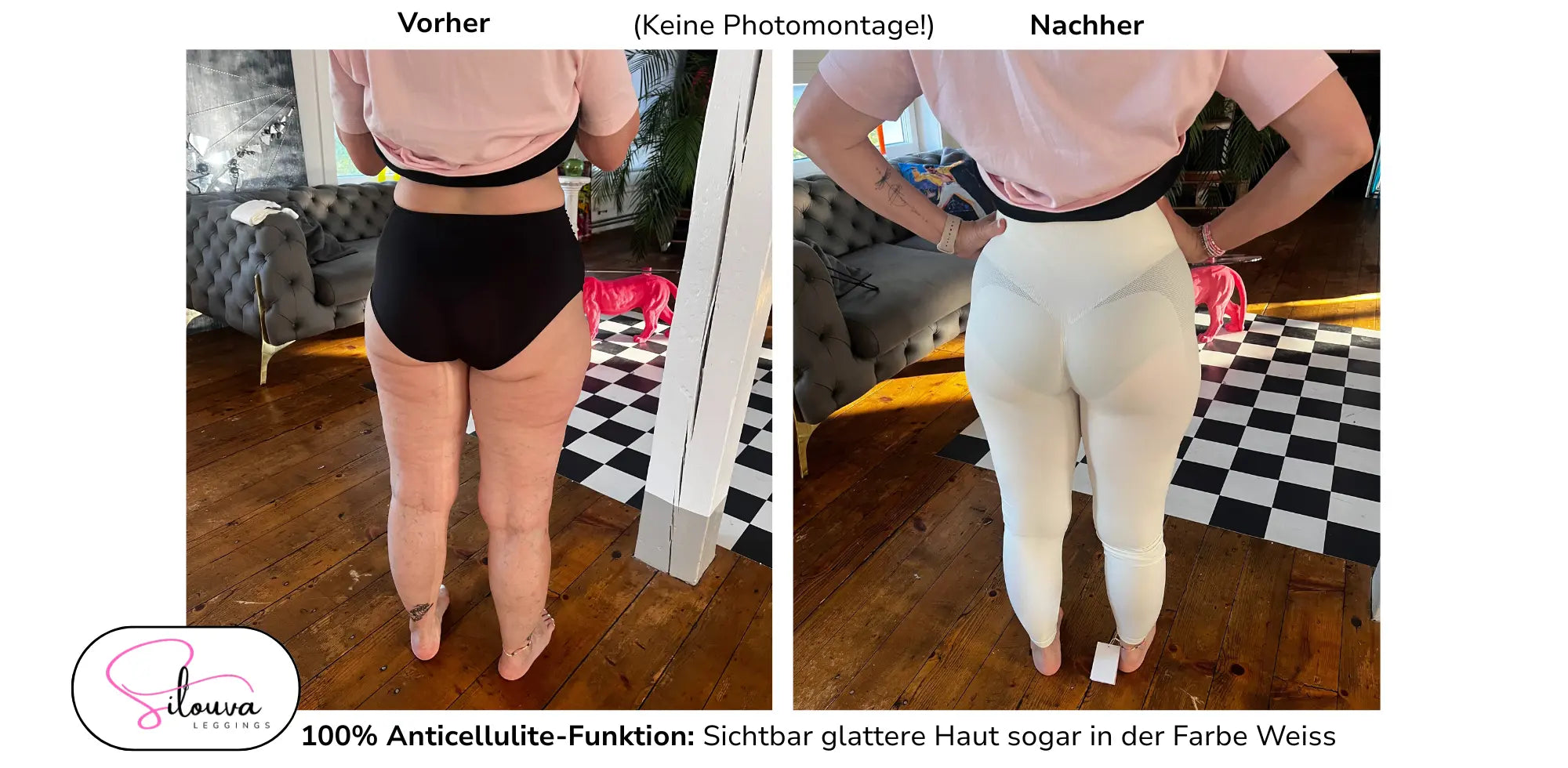 Die Sillouva Leggings zaubern Cellulite nicht einfach weg, aber sie verbessern das Erscheinungsbild sofort sichtbar.
